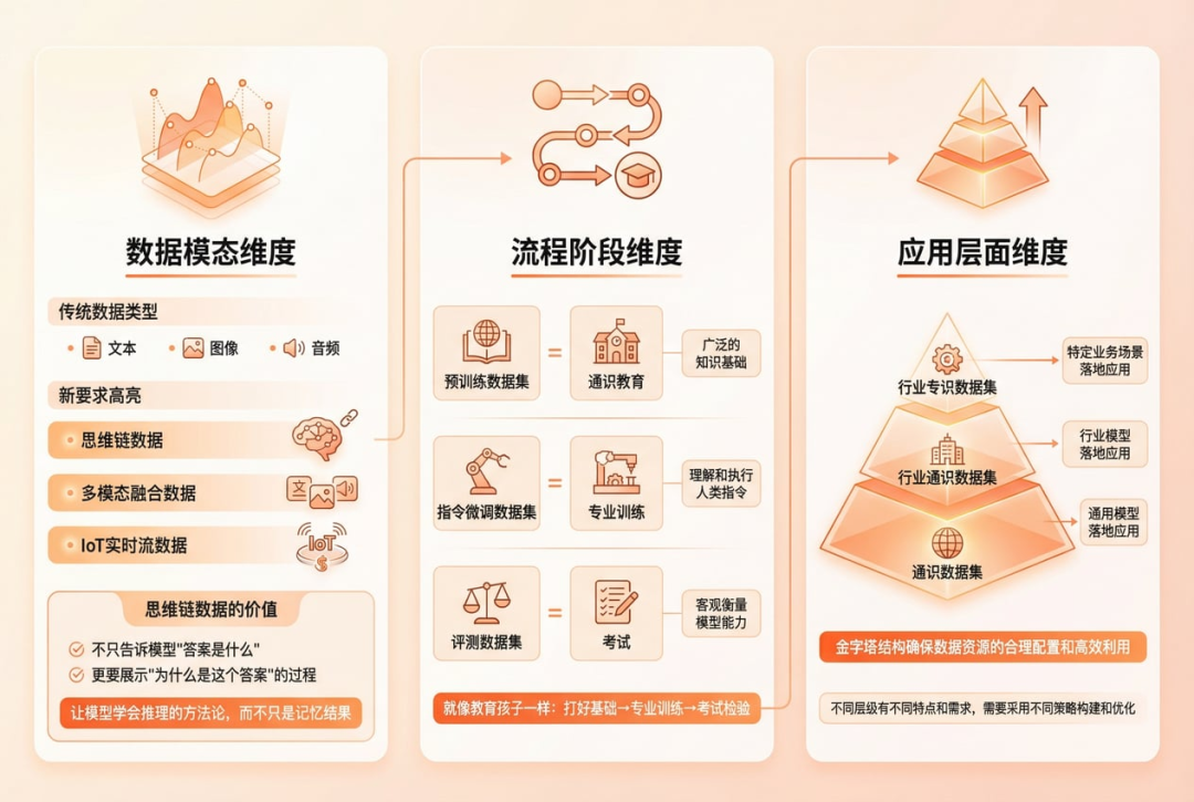 从数据模态来看,现代AI需要的是多维度的数据生态。传统的文本、图像、音频数据仍然是基础,但现在需要更多思维链数据、多模态融合数据,甚至包括IoT设备的实时流数据。