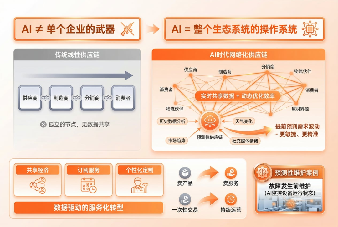 AI时代的供应链变成了网络化的:每个节点都在实时共享数据,动态优化整个链条的效率。