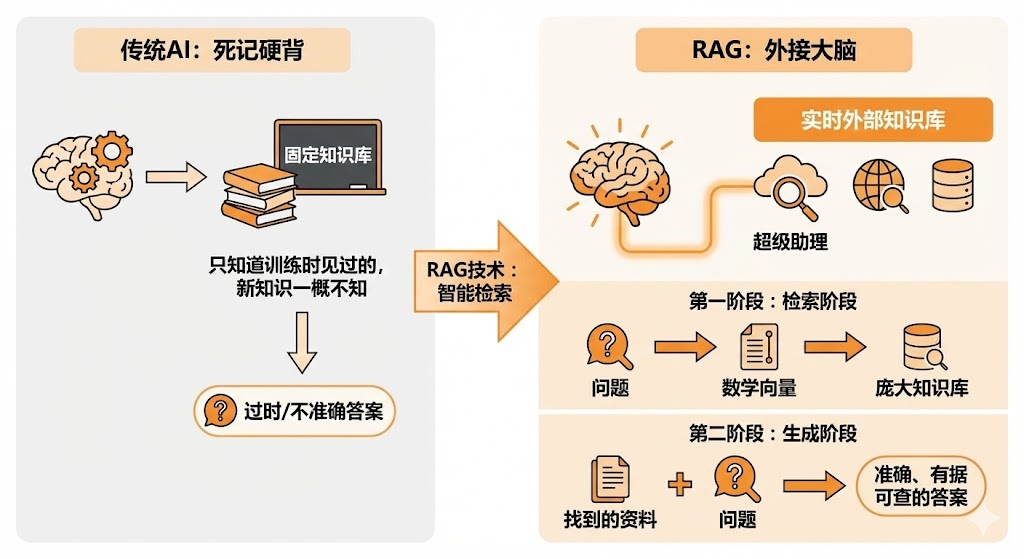 RAG,全称检索增强生成(Retrieval-Augmented Generation),可以说是给AI装上了外接大脑。