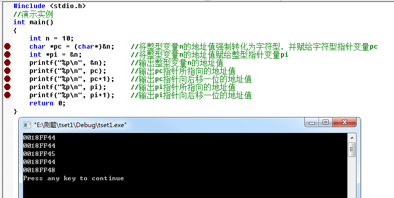 在c语言中,char类型占1个 字节,int类型占4个字节,pc是字符型指针,每次一动只移动一个字节。而pi是整型指针,每次一动移动4个字节。可以通过输出的地址值明显看出。