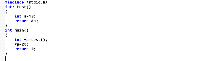 主函数中p指向test函数,在test函数中整型变量a为局部变量,当执行完test函数后变量a的地址返回给操作系统,因此p指针指向的空间释放,p为野指针。