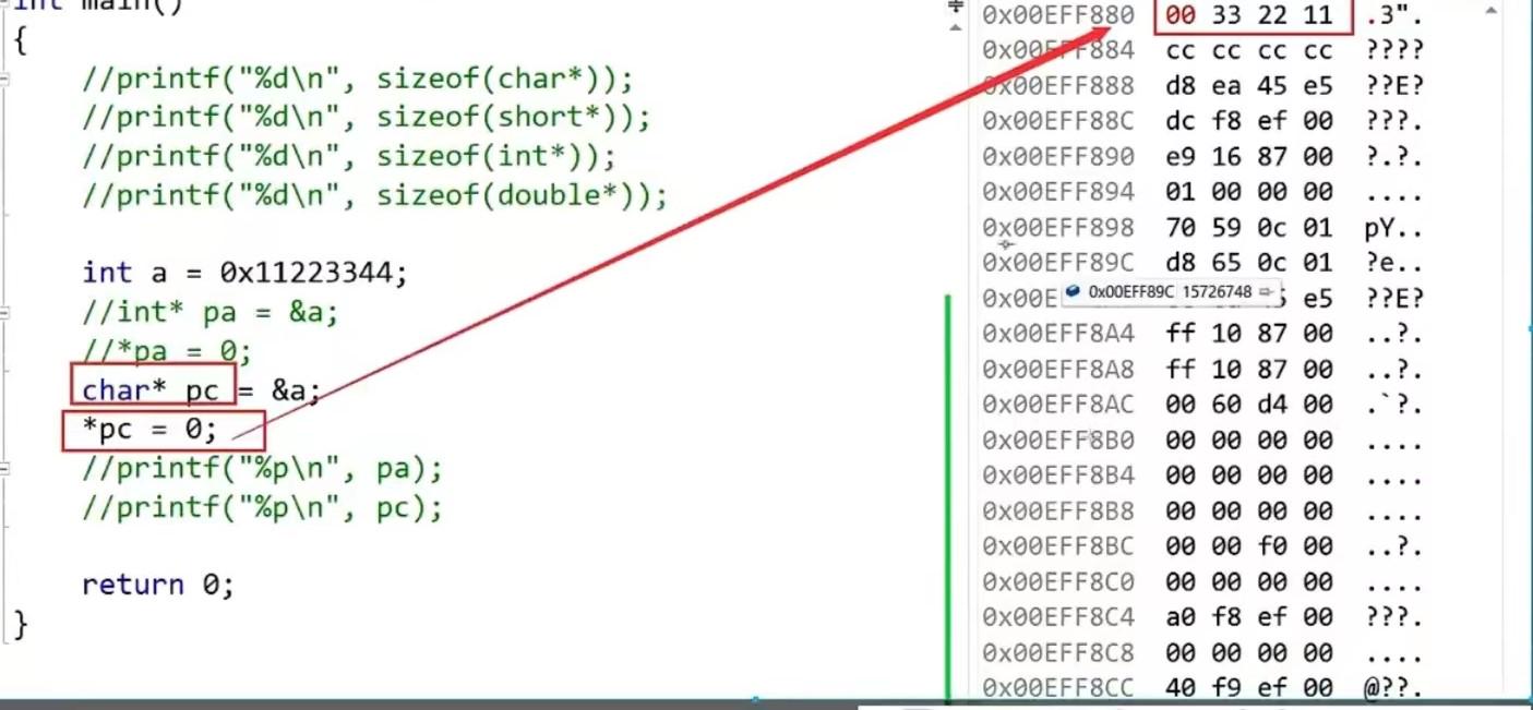 由于pc是字符型指针,解引用后能操作1个字节,从图中可以看出只有一个字节为0。