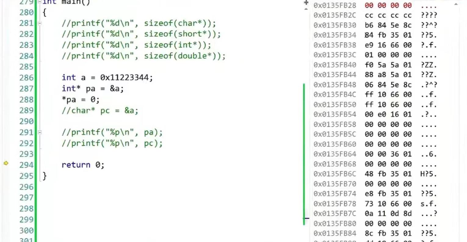由于pa是整型指针,解引用后能操作4个字节,图中可以看出指针指向的内存4个字节全为0。