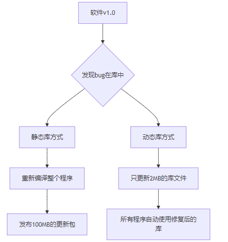 更新维护 | 需要重新编译整个程序 | 只需替换库文件(保持ABI兼容) |