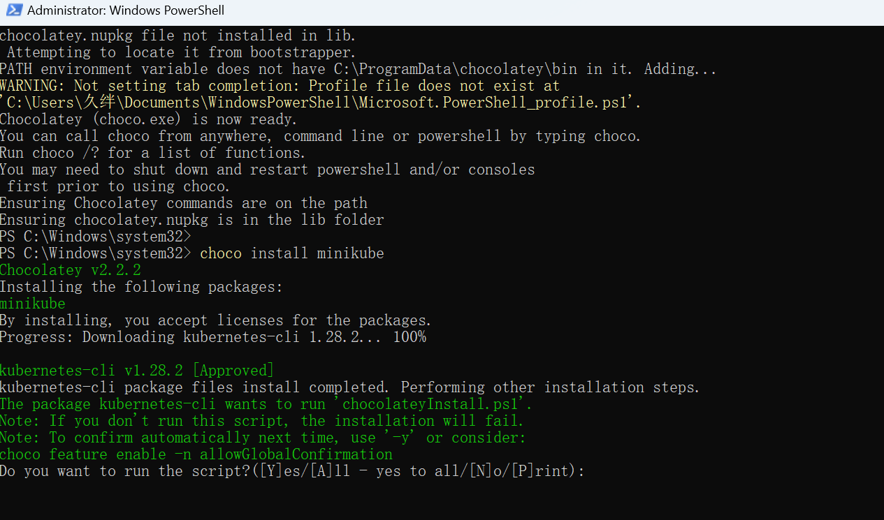 安装 Minikube,一旦 Chocolatey 安装完成,你可以使用以下 Chocolatey 命令来安装 Minikube: