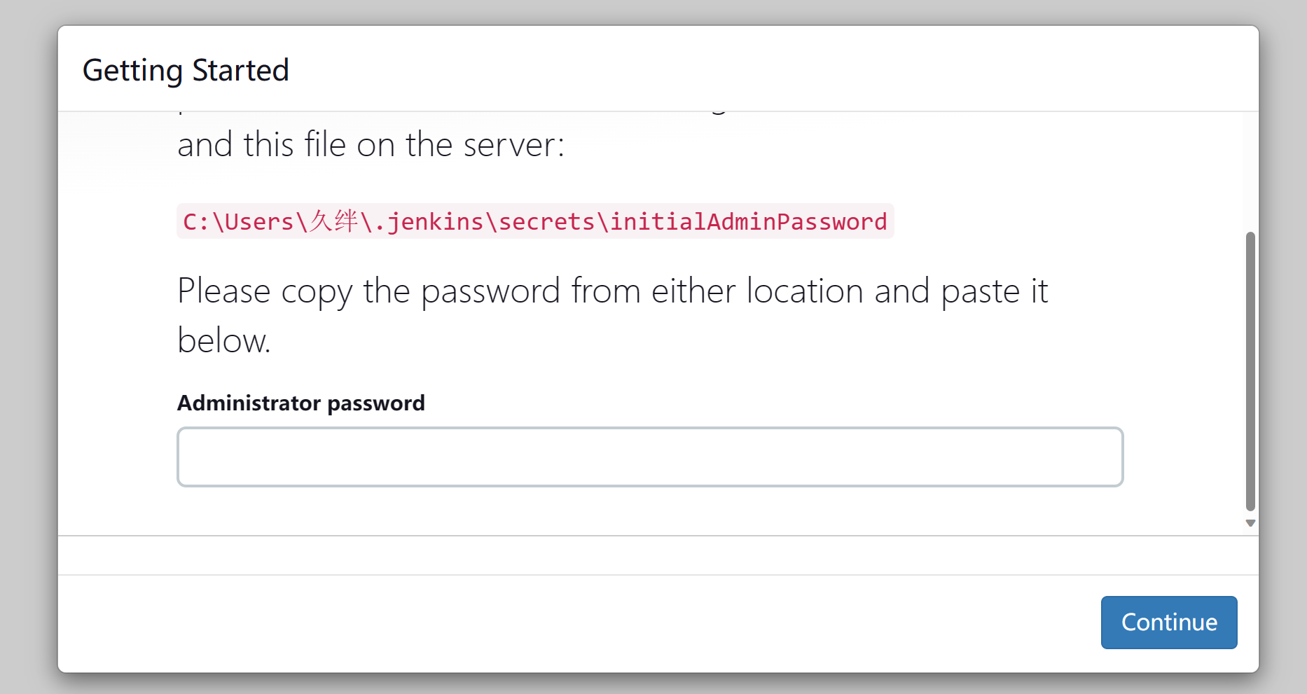 在首次访问时,系统将要求你输入一个初始密码,该密码存储在Jenkins的日志文件中。在控制台窗口中可以找到该密码。输入密码后,点击继续。