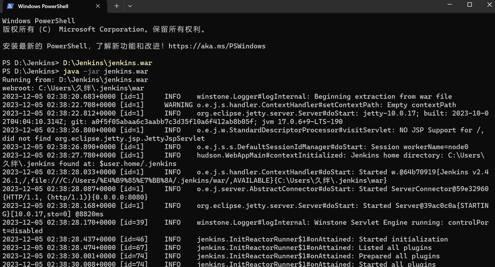 java -jar jenkins.war打开浏览器,访问 http://localhost:8080(默认端口是8080)。