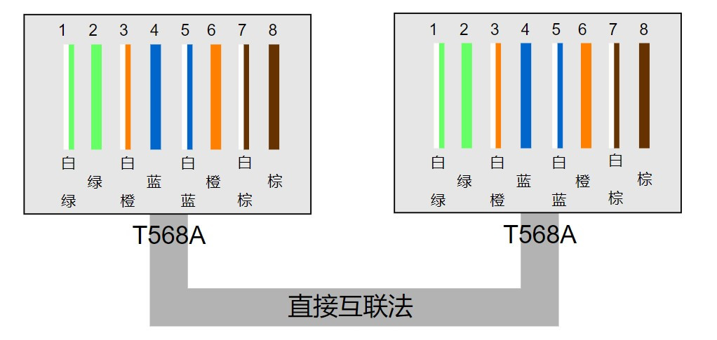 直连互联法排列做出来的通常称之为直连线、平行线,接法是将网线两端同时使用568A或者568B标准(一般用568B标准),即568A-568A,568B-568B[2]。常用于不同设备之间相连,例如交换机和路由器、计算机和路由器,交换机和计算机等。