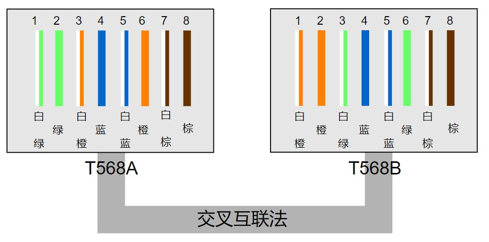 交叉互联法排列做出来的通常称之为交叉线,接法是网线两端分别使用568A标准和568B标准,即568A-568B(图八) [2]。常用于相同设备之间相连,例如计算机和计算机、路由器和路由器、集成器和集成器等。