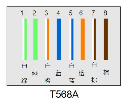 标准568A:绿白-1,绿-2,橙白-3,蓝-4,蓝白-5,橙-6,棕白-7,棕-8。