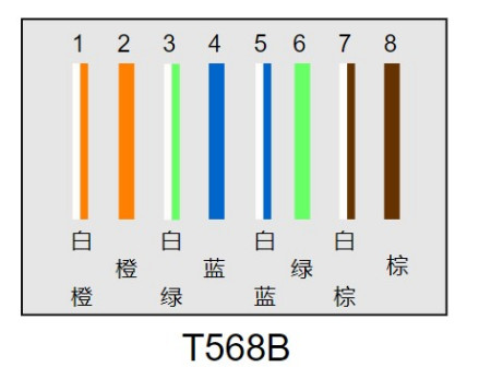 标准568B:橙白-1,橙-2,绿白-3,蓝-4,蓝白-5,绿-6,棕白-7,棕-8。
