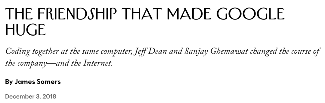 《纽约客》2018年发表的一篇有关Jeff Dean与Sanjay Ghemawat的人物报道《The Friendship That Made Google Huge》(缔造谷歌的友谊)