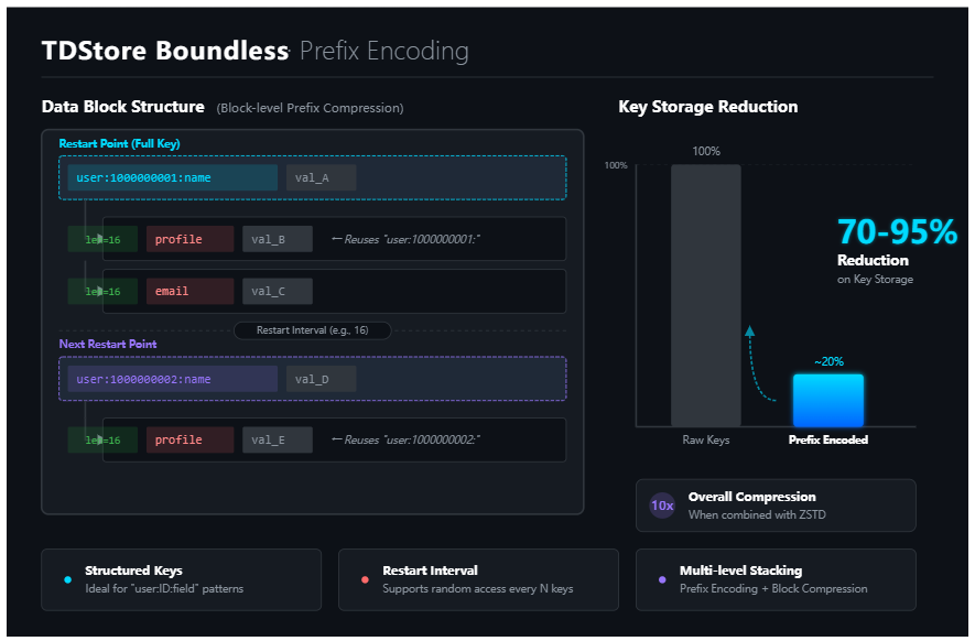 ● 前缀压缩(Prefix Encoding)与差值编码: 在能源订单场景中,大量的订单号、时间戳、用户 ID 具有极高的相似性(例如:202310010001, 202310010002...)。TDSQL Boundless 能够智能识别这些重复前缀,只存储“变化量”。这种针对特定数据类型的极致编码优化,是实现5倍压缩比的幕后功臣。