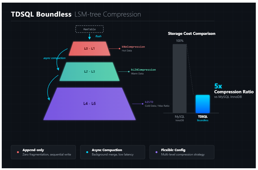 ● 从 B+ 树到 LSM Tree 的进化: InnoDB 的 B+ 树为了维持查询与写入效率,页面中必然存在大量的“空洞”和碎片,尤其是在能链这种高并发随机写入场景下,空间利用率往往只有 50%-70%。 TDSQL Boundless 基于 LSM Tree(Log-Structured Merge-tree),将所有的随机写在内存中聚合,转化为磁盘上的顺序写(Append-only)。数据在磁盘上紧凑排列,没有任何“空洞”,从物理结构上就赢在了起跑线。