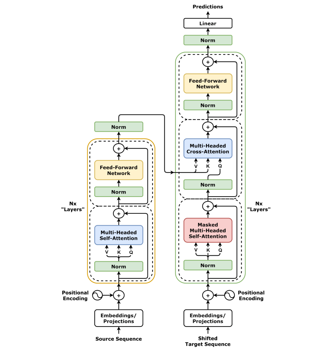 图:Transformer 的基本结构示意图,左侧橙色部分为编码器层(Encoder Layer),右侧绿色部分为解码器层(Decoder Layer)。每个编码器层包含 多头自注意力 子层和 前馈神经网络 子层,并在每个子层后应用残差连接和层归一化(Norm);解码器层在结构上比编码器多了一个 交叉注意力 子层(蓝色模块),但同样包含 FFN 子层。