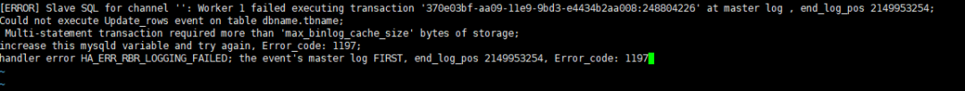 handler error HA_ERR_RBR_LOGGING_FAILED; the event's master log FIRST, end_log_pos 2149953254, Error_code: 1197