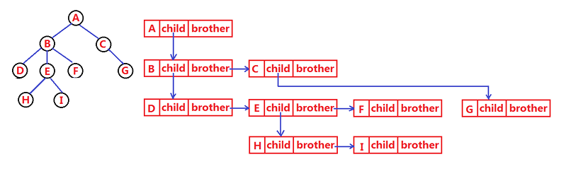 };第二种方法不需要规定树的度,每个根结点也可有任意个子结点,这个也是很常见的方法,被叫做左孩子右兄弟表示法