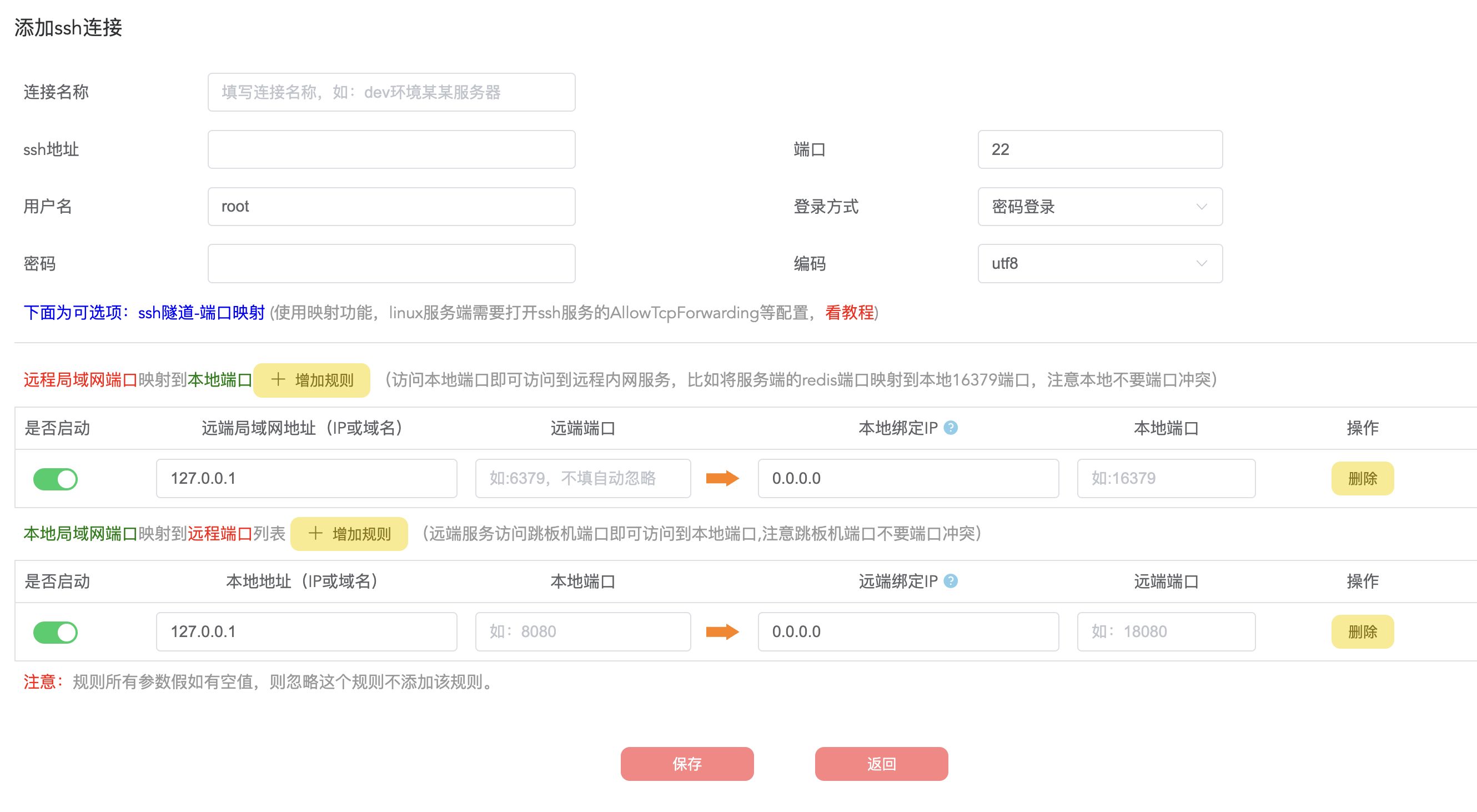 填写ssh跳板机的地址,然后填写需要映射的内网服务器的地址和端口就可以了,如下图所示: