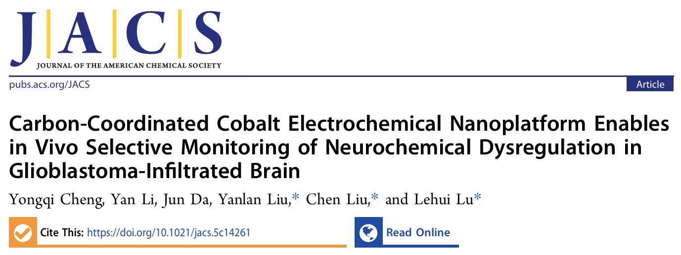 文献信息:Carbon-Coordinated Cobalt Electrochemical Nanoplatform Enables in Vivo Selective Monitoring of Neurochemical Dysregulation in Glioblastoma-Infiltrated Brain. Yongqi Cheng;Yan Li;Jun Da;Yanlan Liu;Chen Liu;Lehui Lu. ISSN: 0002-7863 , 1520-5126; DOI: 10.1021/jacs.5c14261. Journal of the American Chemical Society. , 2026.