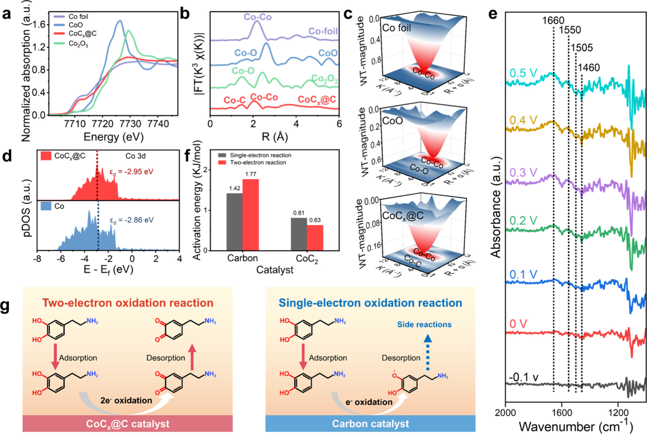 图3通过X射线吸收精细结构(XAFS)与表面增强红外光谱(SEIRAS)揭示了CoC₂@C的催化机理。XANES与FT-EXAFS谱(图3a-b)表明钴处于高价位态,并存在Co-C配位。d带中心下移至-2.95 eV(图3d),削弱了与非目标分子的吸附,提升了选择性。SEIRAS实时监测(图3e)显示DA在氧化过程中特征峰逐渐消失,同时出现醌式结构(C=O,C=C)的特征峰,证实了DA直接转化为多巴胺醌(DAQ)的两电子路径。理论计算进一步表明(图3f-g),碳配位钴催化路径的活化能低于单电子途径,避免了自由基副产物的生成。