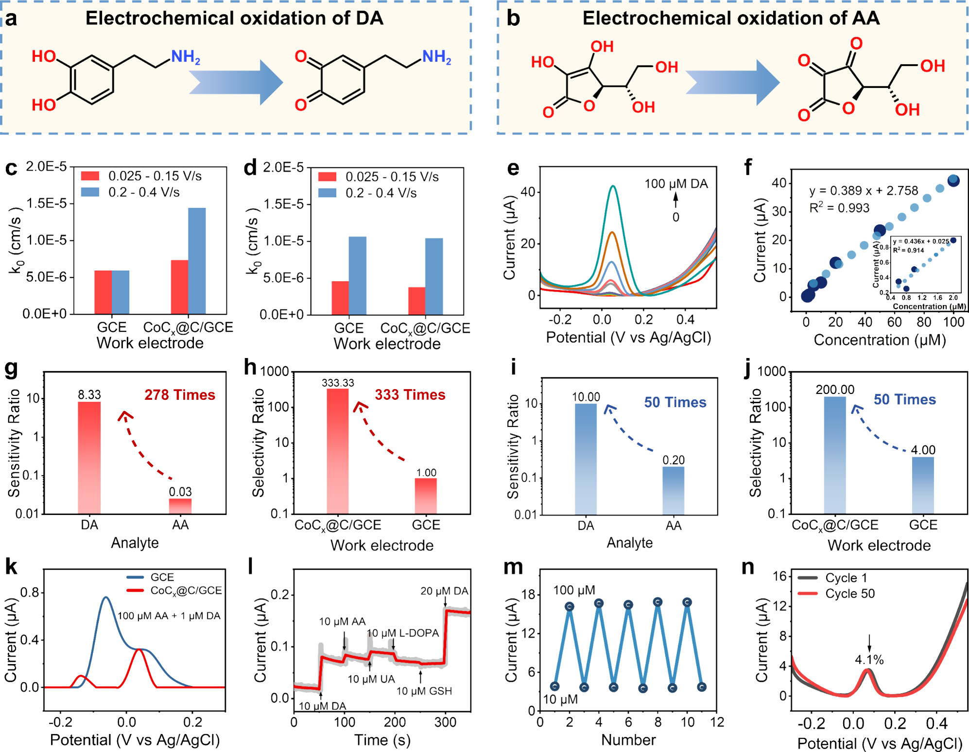 图2系统评估了CoC₂@C在人工脑脊液(aCSF)中的电化学性能。DPV曲线(图2e)显示其在低浓度DA(0.6–100 μM)范围内呈现优异线性响应,检测限低至0.13 μM(图2f)。与裸玻碳电极(GCE)相比,CoC₂@C对DA的电子转移速率提升超过123%(图2c),而对AA的响应则被显著抑制(图2d)。在存在100倍过量AA的复杂体系中(图2k),CoC₂@C仍能清晰分辨DA与AA的氧化峰,展现了卓越的抗干扰能力。此外,计时电流法(图2l)与连续扫描测试(图2n)证明了其良好的可逆性与长期电化学稳定性。