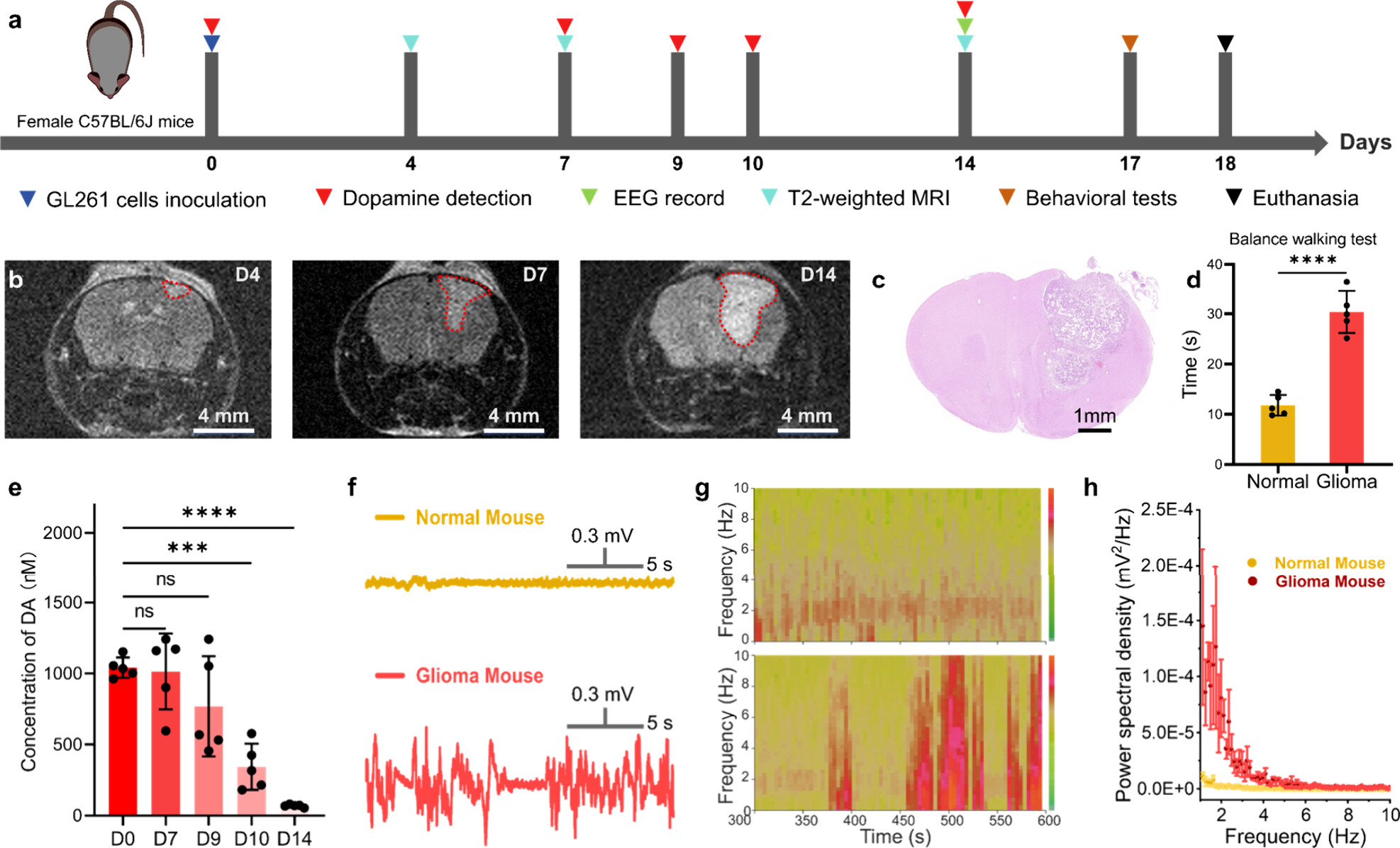 图4:GBM模型中DA失调的原位监测与神经功能关联分析
