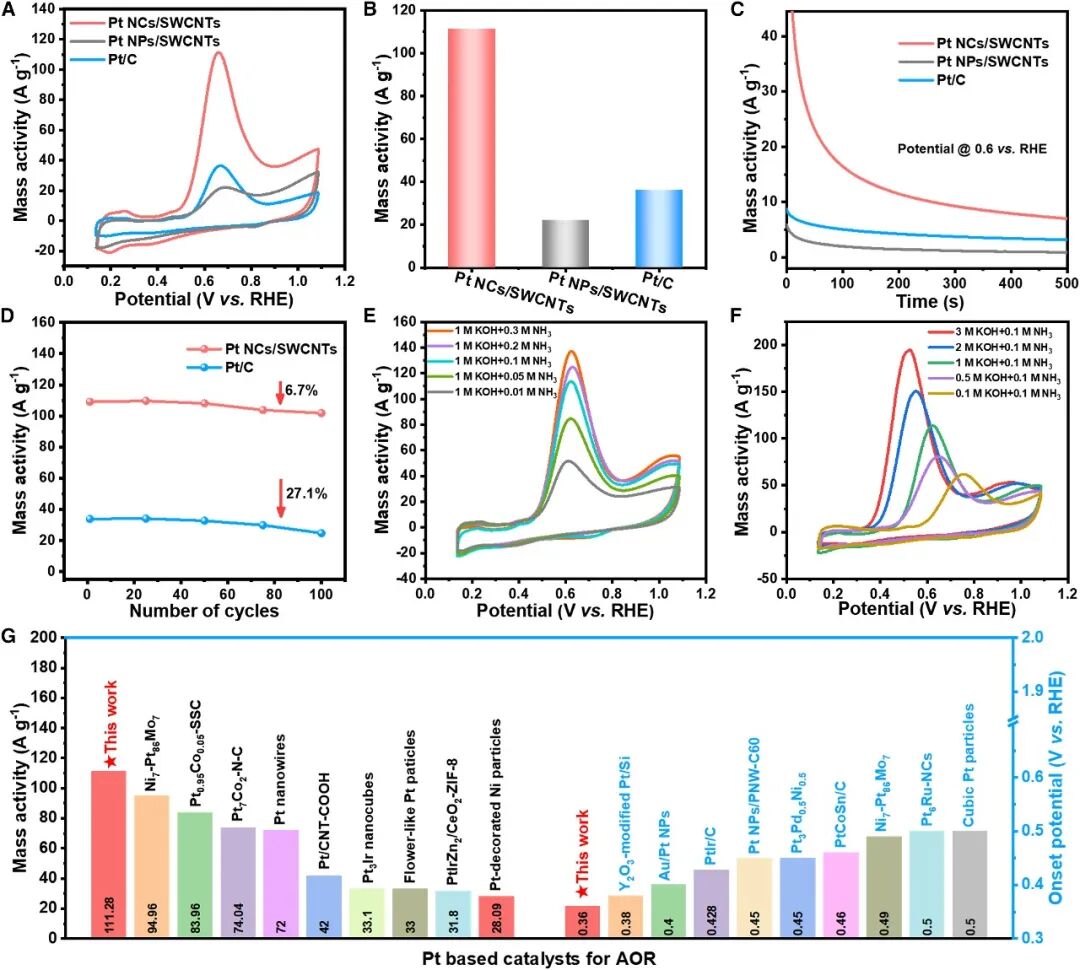 电化学测试表明,Pt NCs/SWCNTs在AOR中具有最低起始电位(0.36 V vs. RHE)和最高质量活性(111.3 A g⁻¹),分别为商业Pt/C的3倍和5倍。计时电流法及循环稳定性测试显示其活性衰减缓慢,结构稳定性优异,归因于铂立方体与碳管间的强相互作用及{100}晶面的抗毒化能力。