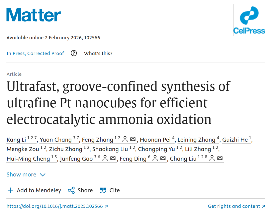 2026年02月02日,中国科学院金属研究所刘畅/张峰研究员、苏州实验室前沿材料研究部丁峰研究员、大连理工大学物理学院高峻峰教授团队在Matter期刊发表题为“Ultrafast, groove-confined synthesis of ultrafine Pt nanocubes for efficient electrocatalytic ammonia oxidation”的研究论文。本研究采用磁控溅射结合超快速加热与冷却方法,在单壁碳纳米管束的沟槽中成功合成了超细(~2.0 nm)、以{100}晶面为主的铂纳米立方体。具体方法为:先在SWCNT网络上沉积单分散Pt纳米颗粒,随后在含微量氧气(约10 ppm)的环境中,以约550°C/s的极快升温速率加热至1100°C并快速冷却,诱导Pt纳米颗粒发生重构。碳纳米管沟槽提供了径向限域与轴向诱导的模板作用,而微量氧则选择性地稳定了{100}晶面。核心发现表明,所得铂纳米立方体/SWCNT复合材料在氨氧化反应中表现出卓越的催化性能,其质量活性高达111.3 A g⁻¹,起始电位低至0.36 V vs. RHE,并具有优异的稳定性,综合性能超越商业铂碳催化剂。