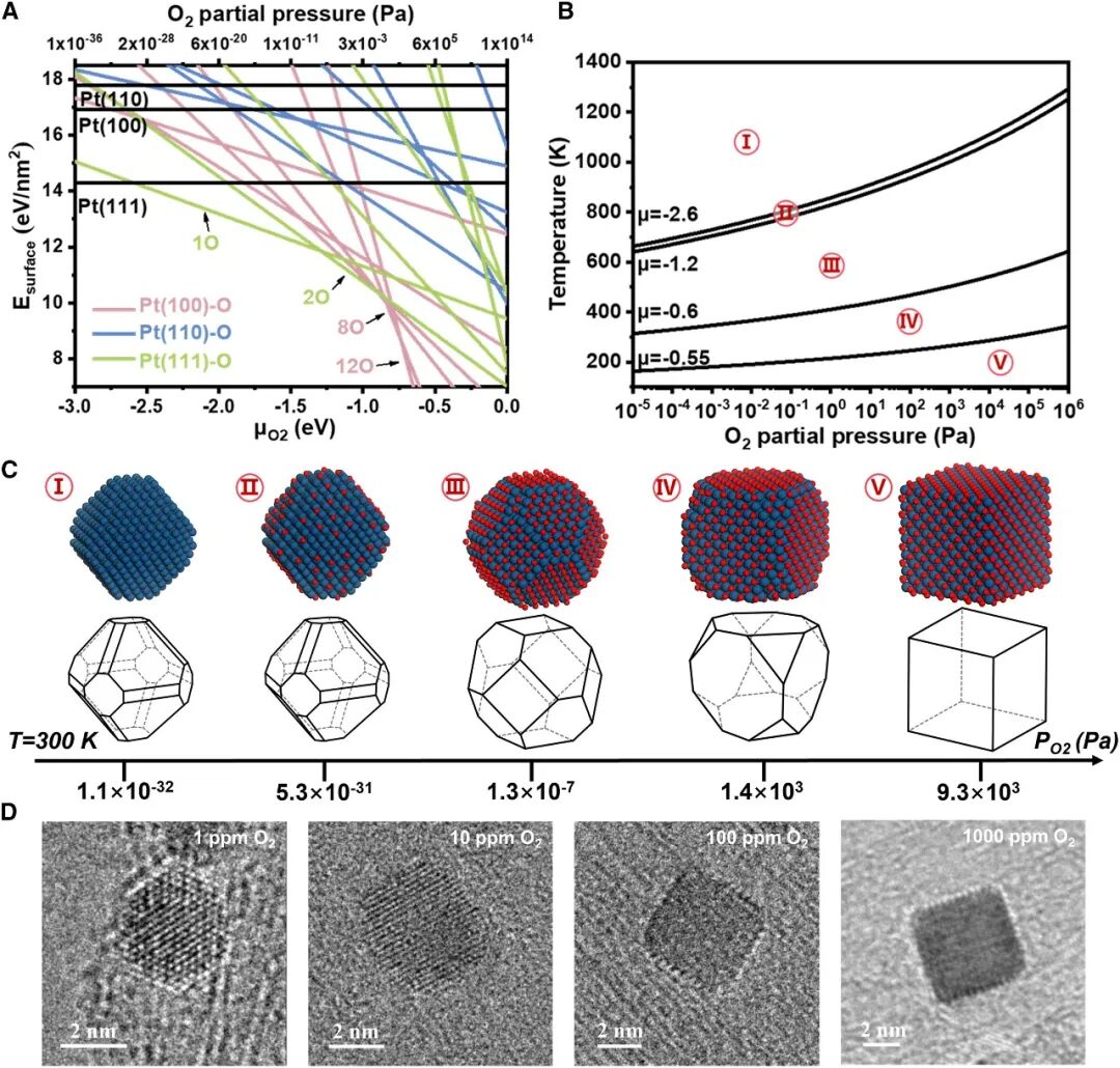 结合DFT计算与Wulff重构模型,揭示了氧化学势对铂纳米颗粒形貌的影响:低氧时呈截角八面体,中氧时过渡为球状,高氧时形成规整立方体。TEM图像与模拟结果高度吻合,表明氧吸附可稳定{100}晶面,实现形貌可控合成。