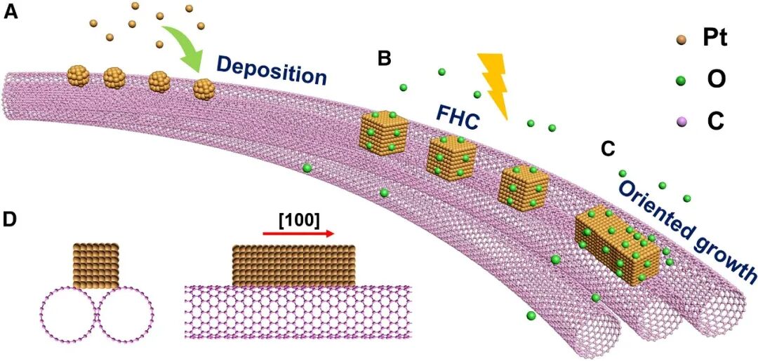 该图展示了铂纳米立方体在碳纳米管沟槽中的合成路径:首先通过磁控溅射在SWCNT束表面沉积单分散铂纳米颗粒;随后在含微量氧环境下进行快速加热与冷却处理,促使铂颗粒沿碳管轴向重构;沟槽的限域效应抑制径向生长,微量氧吸附降低{100}晶面表面能,最终形成立方体结构并沿碳管轴向排列。