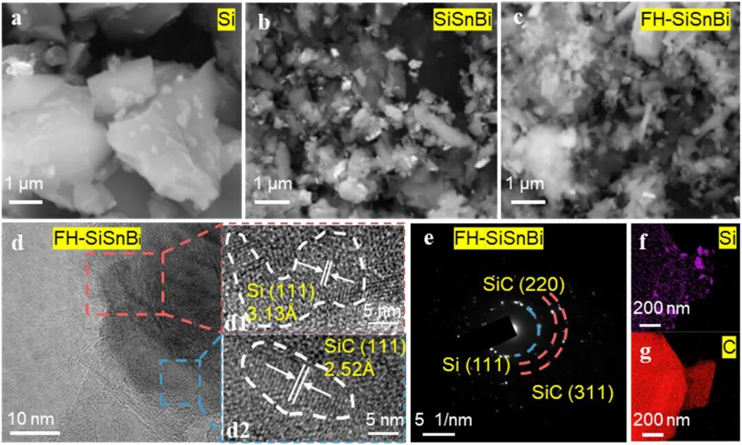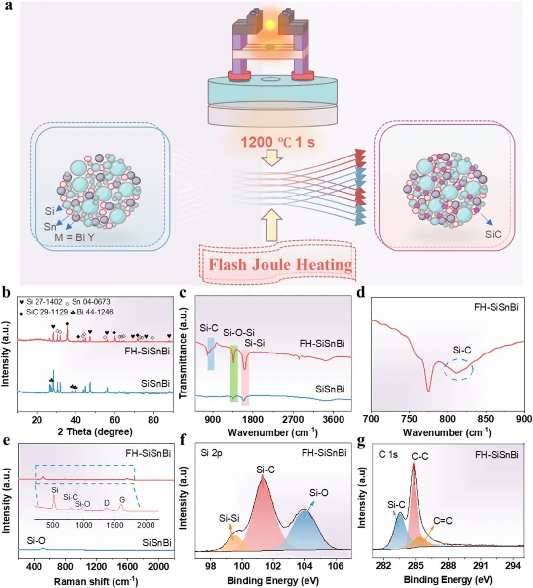 通过XRD图谱(图1b)确认了Si晶体衍射峰及SiC特征峰(JCPDS 29-1129),证实闪速焦耳加热过程中碳纸作为碳源参与反应,在SiSnBi颗粒表面及近表面原位生成SiC。FT-IR与Raman光谱(图1c–e)进一步揭示Si–C键的形成,XPS中Si 2p与C 1s谱(图1f–g)显示SiC键合峰(101.5 eV),表明SiC以纳米相形式富集于颗粒界面。