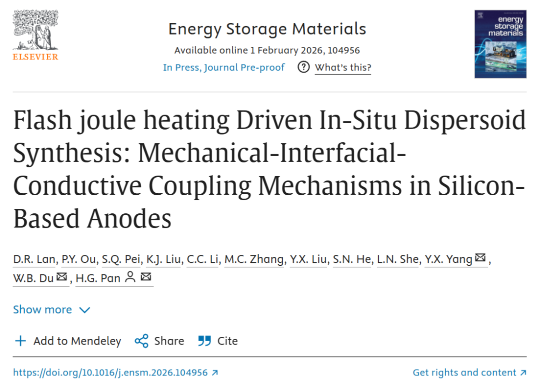 2026年02月01日,西安工业大学潘洪革、杨亚雄团队在Energy Storage Materials期刊发表题为“Flash joule heating Driven In-Situ Dispersoid Synthesis: Mechanical-Interfacial-Conductive Coupling Mechanisms in Silicon-Based Anodes”的研究论文。本研究提出了一种创新且可规模化的三步联用制备策略:首先通过真空熔炼将硅与低熔点金属(锡、铋或钇)制成均匀的前驱体合金(SiSnM),以解决纯硅导电性差、无法直接进行焦耳加热的问题;接着利用砂磨技术将合金锭粉碎并精细控制颗粒尺寸至亚微米级(0.7-1微米),以缩短离子传输路径并增大反应比表面积;最后,将前驱体粉末置于卷曲的碳纸中,施加瞬时高电流进行闪蒸焦耳加热(1秒内升温至约1000°C)。在此极端非平衡条件下,碳纸作为碳源与合金颗粒表面及近表面的硅发生快速反应,原位生成纳米级SiC并均匀分散于基体中,最终得到FH-SiSnM复合负极材料。该策略的核心在于,三步工艺环环相扣:熔炼引入导电网络骨架,砂磨优化颗粒形态与混合均匀性,而闪速加热则一步实现了SiC的原位合成、缺陷工程以及颗粒表面的瞬时熔融致密化。系统性表征证实,此方法成功构建了“金属相-SiC-硅”三相协同增强的复合结构,同步攻克了硅基负极的导电性差、SEI不稳定和体积膨胀大三大瓶颈。