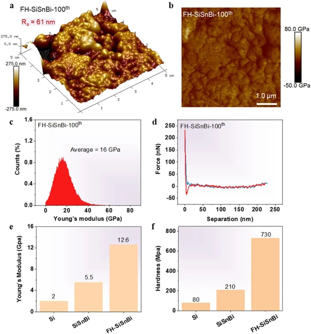 AFM测试(图7a–d)显示FH-SiSnBi循环后表面粗糙度降低(164 nm → 61 nm),杨氏模量保持16 GPa。纳米压痕测试(图7e–f)表明FH-SiSnBi的弹性模量(12.6 GPa)与硬度(730 MPa)显著高于纯Si,证实SiC的弥散增强效应。