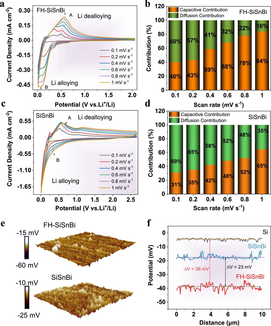 不同扫速CV曲线(图5a)计算得到b值介于0.76–0.84,表明FH-SiSnBi的储锂机制为扩散与赝电容混合控制。赝电容贡献比例随扫速升高增至84%(图5b),显著高于SiSnBi(64.8%)。EFM与Zeta电位测试(图5e–f)显示FH-SiSnBi表面电势降低,电子给予能力增强,有利于电荷均匀传输。