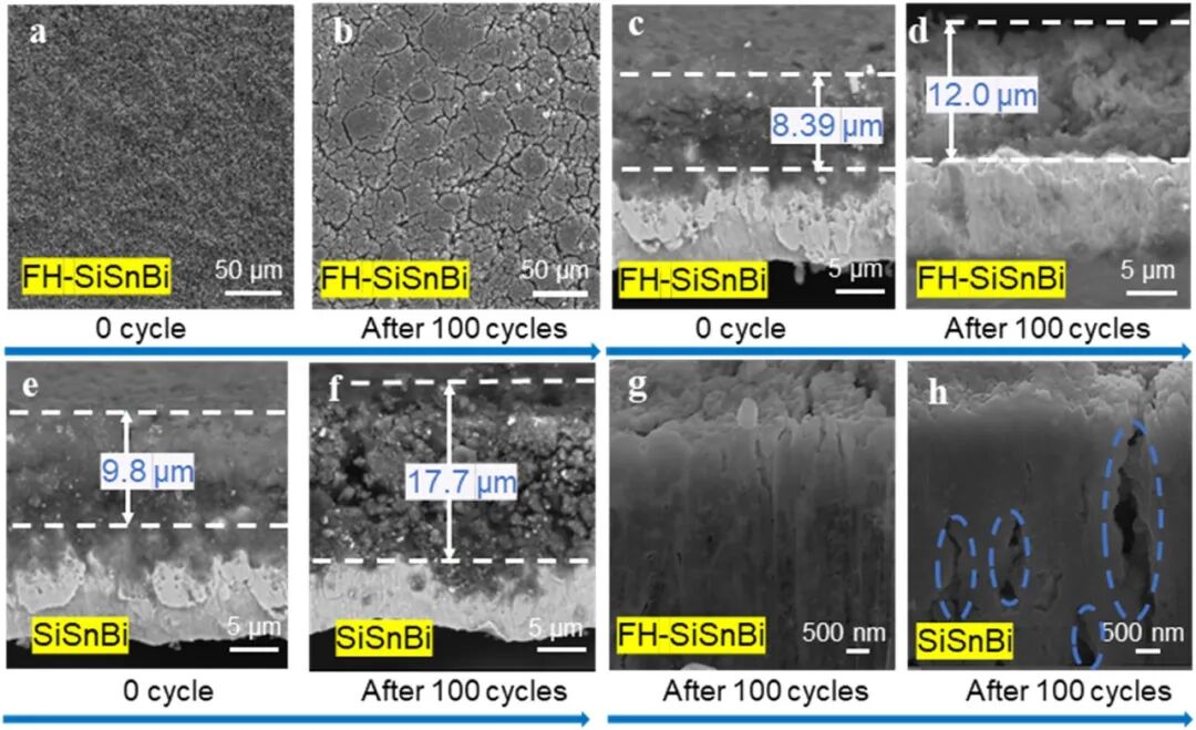 SEM图像(图8a–h)显示FH-SiSnBi循环后仅出现微裂纹,而Si与SiSnBi则发生严重褶皱与开裂。截面分析表明FH-SiSnBi的体积膨胀率仅为143%,远低于Si(308%)与SiSnBi(181%)。FIB‑SEM进一步证实FH-SiSnBi中裂纹数量显著减少。
