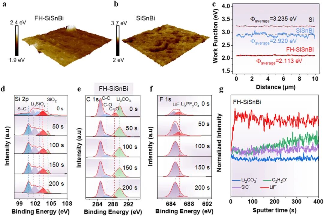 XPS深度剖面(图6d–f)显示循环后电极表面富含LiF、Li₂CO₃等组分,随刻蚀加深Si–C键信号增强,证实体相中SiC稳定存在。TOF-SIMS(图6g)进一步确认SEI内层以LiF为主,外层含有机组分,形成稳定的有机‑无机杂化SEI结构。