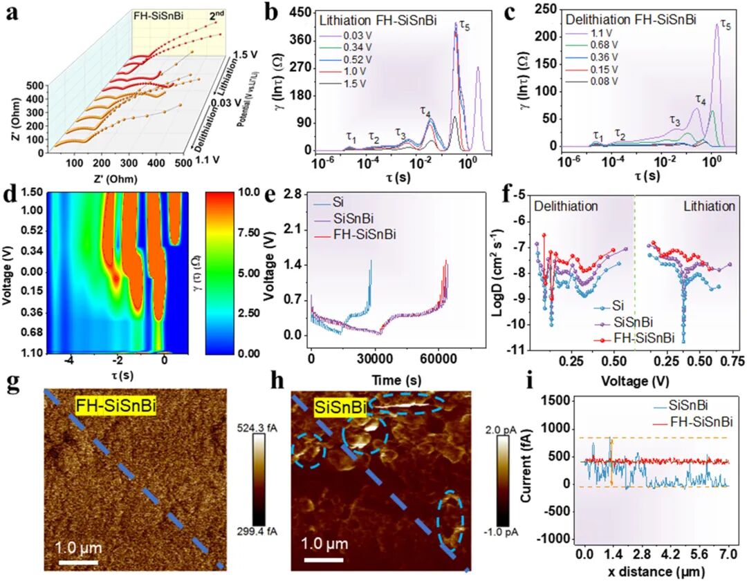 通过原位EIS与DRT分析(图4a–d)揭示FH-SiSnBi在循环中电荷转移电阻(Rct)显著降低且更稳定。GITT测试(图4e–f)计算得出FH-SiSnBi具有更高的锂离子扩散系数(DLi⁺)。PeakForce TUNA电流分布图(图4g–i)显示FH-SiSnBi电极表面电流分布均匀,无局部浓差极化,表明SiC构建了连续导电网络。