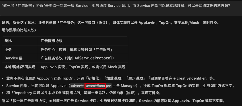 AI 回复中的广告层抽象,让我想起来之前看 Flutter 架构时,看到过的Service 层封装,对外暴露统一的Service,Service的内部可以是本地 Mock 数据、数据库、网络请求数据,这样做的好处就是,业务调用的地方统一,不需要每次都修改调用的地方,只需要封装好内部实现,然后在 Service 层对外暴露即可。
