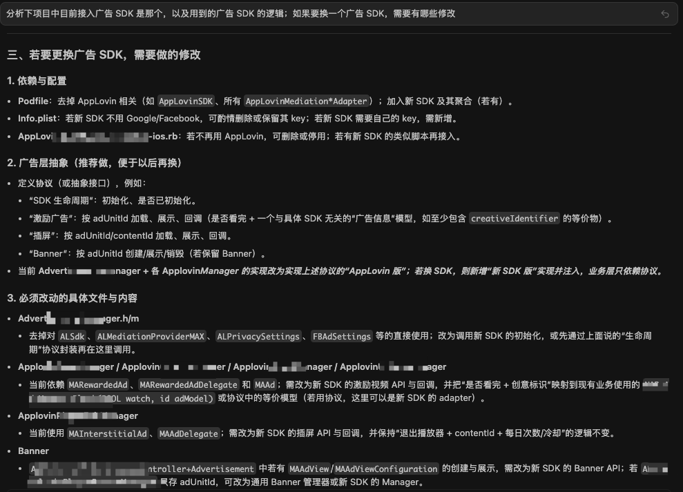 上面一整套执行完,一下午就完成了从 AppLovin 切换到 TopOn 的需求,体验就是:使用 AI 确实提升了效率,但是其中也有一些问题,比如:新接入的 SDK,对比原来的 SDK,缺失了很多埋点逻辑等,需要人工排查发现问题,然后再通过 AI 来修复。