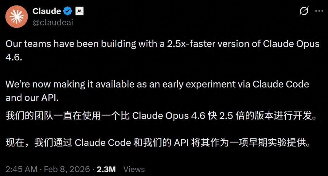 昨日(2月8日),Claude Opus 4.6上线了一个极速模式(Fast mode),性能一致,速度却达到了正常模式下的2.5 倍! 从工程角度看,这不是功能升级,而是一个性能调优变量。