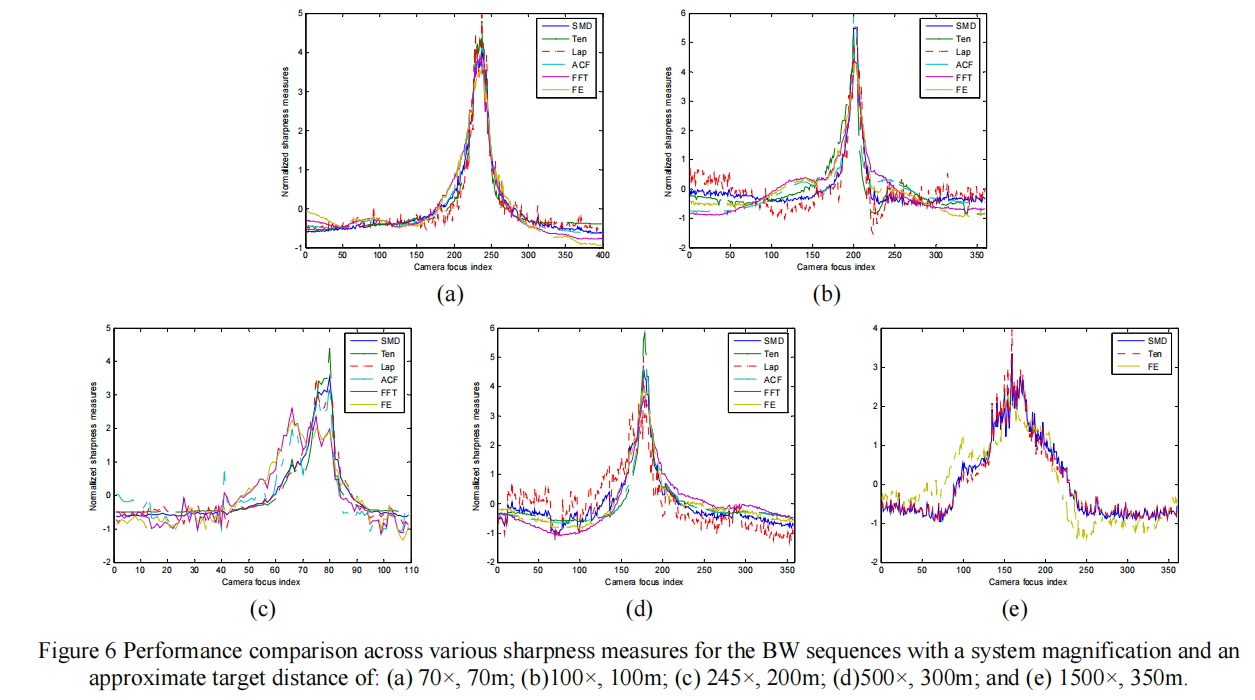 高倍率成像系统会因空气湍流、细节采集受限及物镜光束收集不足等问题而产生成像劣化。这导致最终图像常出现模糊且对比度不足的情况,进而显著提升锐度测量指标中的噪声水平。随着系统放大倍率的增加,图像模糊现象愈发严重,噪声水平也随之攀升。此外,在这种情况下,部分锐度测量指标难以维持所需的单峰形态,反而会观测到多个局部最大值。当系统放大倍率超过1500倍时,针对我们测试的序列,仅有三种锐度测量指标(SMD、Tenengrad和FE)能生成形态合理的响应。