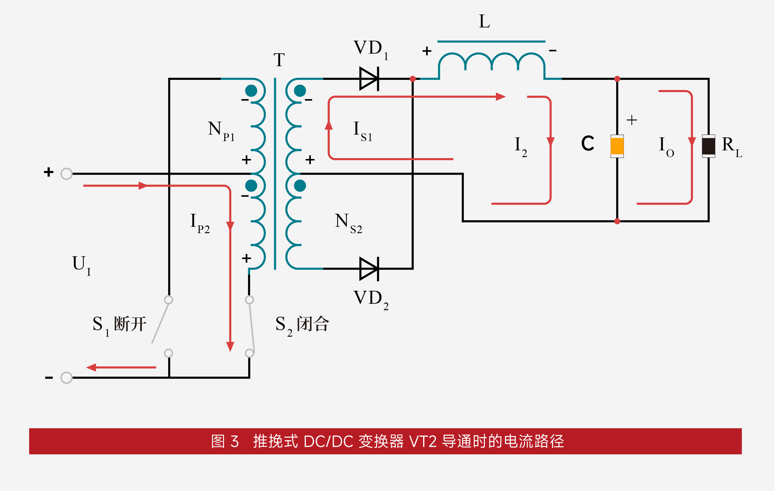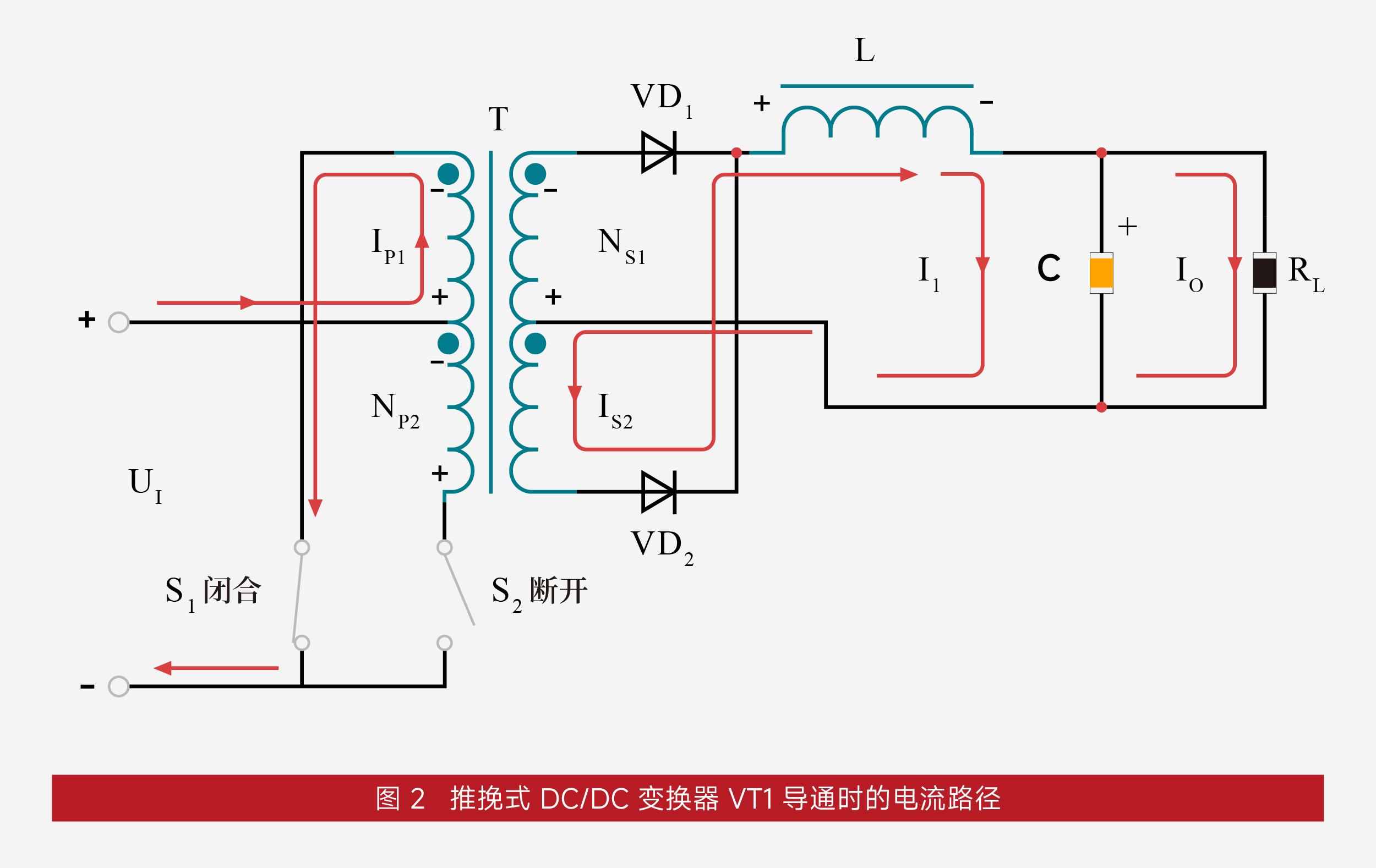 依据电磁感应原理,初级绕组 NP1及次级绕组 NS1、NS2 的感应电压极性均为上 “+” 下 “-”,此时 VD1 导通、VD2 截止;