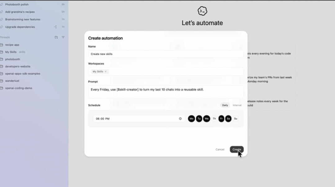 这是我最兴奋的功能。你可以设置 Codex 定时执行任务: