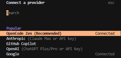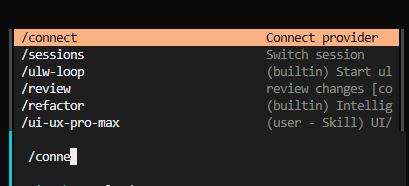 安装好 OpenCode 之后,输入 /connect 命令来连接模型: