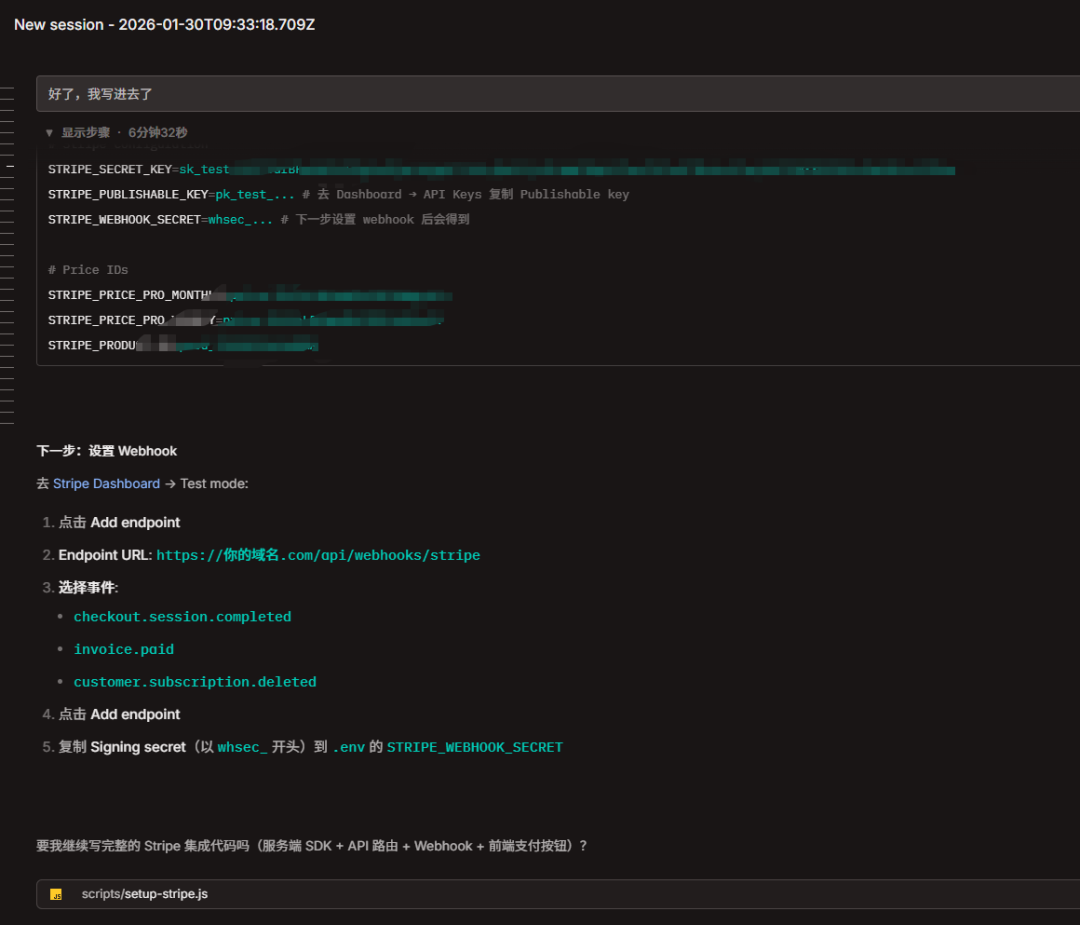 它直接帮我写了一个脚本,只需要填入密钥就好。我去 Stripe 后台拿到密钥,填进去: