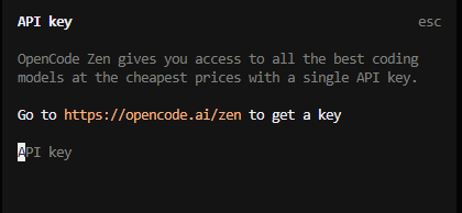 然后输入你的 API Key 就可以使用了。Key 可以去 OpenCode 官网的 Zen 模块申请: