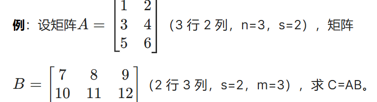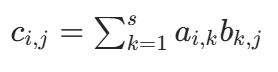 设 C=AB,其中 A 是 n×s 矩阵,B 是 s×m 矩阵,C 是 n×m 矩阵,那么 C 中第 i 行第 j 列的元素cij的计算公式为: