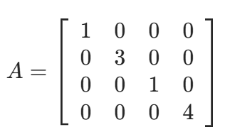 主对角线之外的元素均为 0的方阵称为对角矩阵,简单说就是只有主对角线上有非 0 元素,其余位置全 0。对角矩阵是三角矩阵的特殊形式,上三角和下三角矩阵的交集就是对角矩阵。例:4 阶对角矩阵