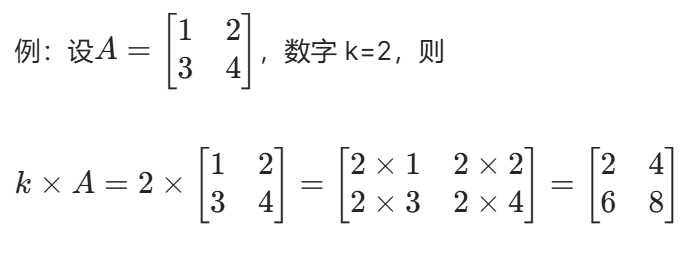 矩阵数乘指的是一个数字乘以一个矩阵,规则是:矩阵中的每一个元素都乘以这个数字,结果矩阵的行数和列数不变。这里的 “数” 可以是整数、小数,正数、负数均可,数乘是对矩阵的整体缩放,不会改变矩阵的维度。