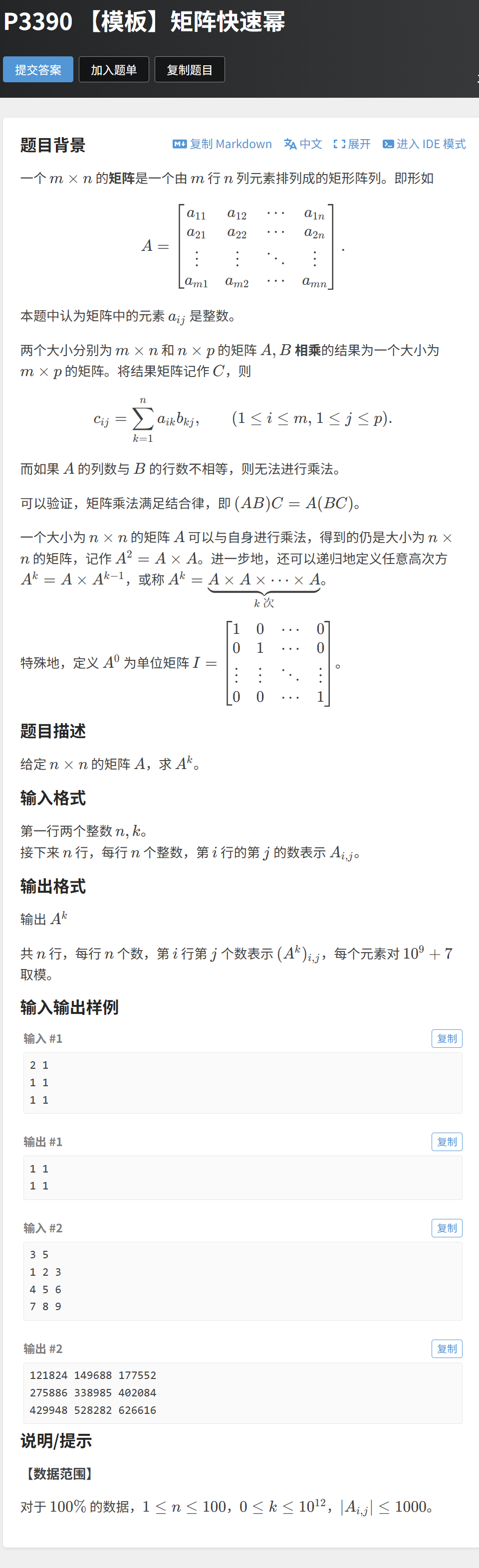洛谷 P3390 【模板】矩阵快速幂:给定 n×n 的矩阵 A,求Ak,结果矩阵的每个元素对109+7取模。